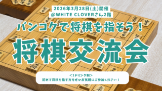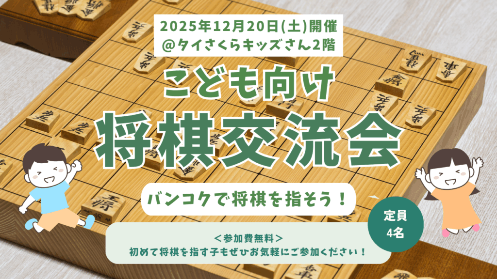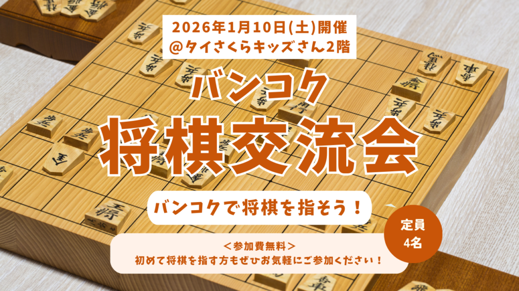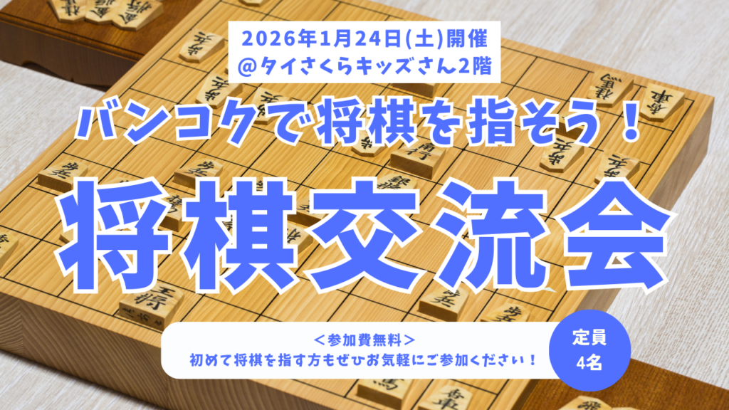 ホーム 2026.01.31 将棋イベント 【2026年3月28日(土)開催】バンコク将棋交流会@WHITE CLOVERさん01/03/2026 【募集終了】将棋交流会@タイさくらキッズさん31/01/2026 【募集終了】将棋体験&対局会@コミュニティ英会話さん11/01/2026 【年末のご挨拶】今年もありがとうございました29/12/2025 【募集終了】将棋交流会@タイさくらキッズさん24/12/2025 【募集終了】将棋交流会@タイさくらキッズさん21/12/2025 【募集終了】子供向け将棋交流会@タイさくらキッズさん29/11/2025